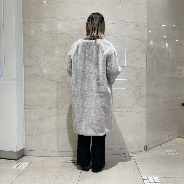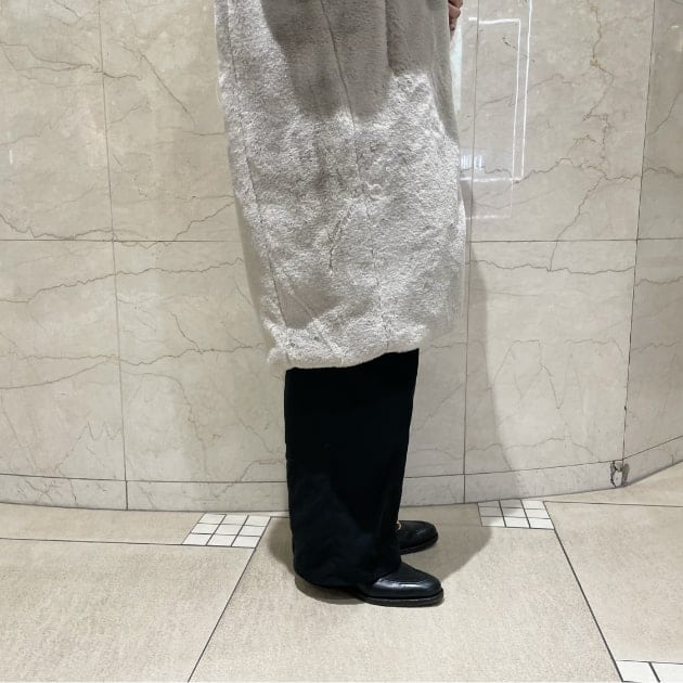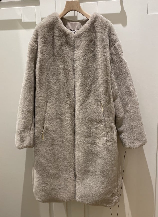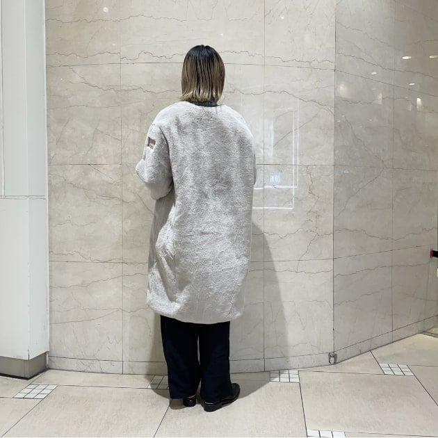 艶のある華やかなボア素材を使用したノーカラーロングベスト。