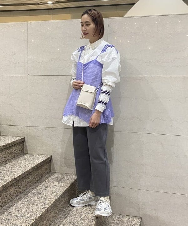 カラーレースのキャミソールとビッグシャツの見事なレイヤードスタイル、素敵です。