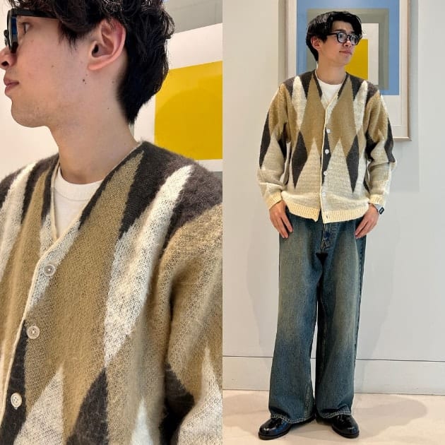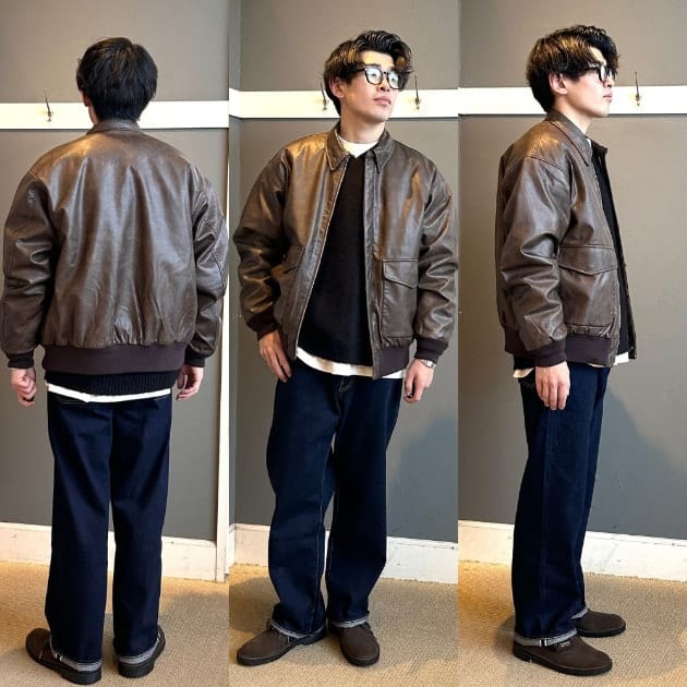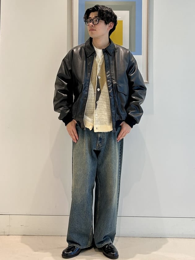 コーディネート①と同じ「フェイクレザーA2ジャケット」を使いながら、こちらはよりラフでストリート感のある印象に仕上げました。中に合わせたのは、TOWN CRAFT別注のシャギーカーディガン。こちらも毛足のある柔らかな素材で、羽織るだけで季節感を演出してくれます。Vネックニットよりもさらにゆるいシルエットで、カジュアルさとリラックス感がアップ。「ちょっと抜け感を出したい」「かっちりしすぎるのは苦手」という方におすすめです。