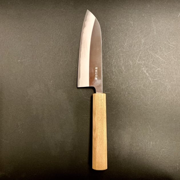 シンプルで目を惹くスタイリッシュな越前打刃物。「のん」さんがデザインした『火』のモチーフを施した、長年愛用していただけること間違いなしの仕上がりです。また柄の部分には角が付いており、安定感あり。女性にも安心して使っていただける包丁です。