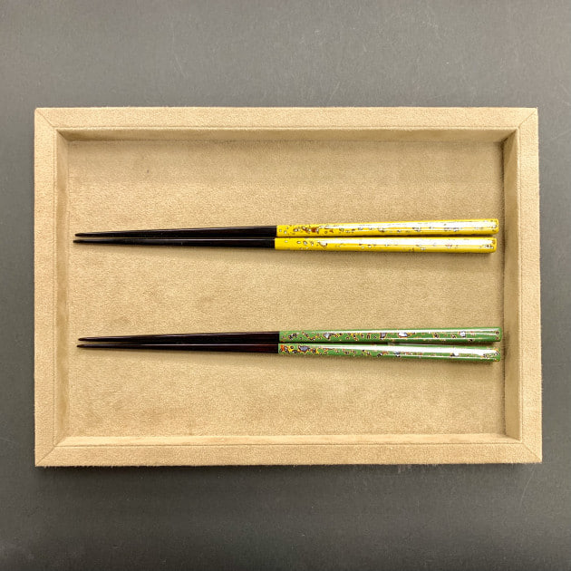 若狭塗の研ぎ出し技法を用いて作られたお箸。漆塗のため、お直しをしていただくと長く愛用していただけるアイテムです。黄色・緑色と華やかなカラー展開で、ギフトとしてもオススメです。