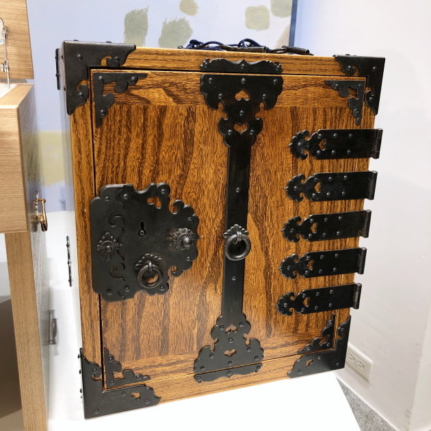 見た瞬間、その手作業で作ったとは思えない精巧さや美しさに惹かれました..漆塗と黒の金具で高級感のある仕上がりに。ここまで金具が多く付いているのは越前箪笥ならではだそうです。特別なものを入れておきたい、特別な箪笥。是非店頭で一度ご覧ください。