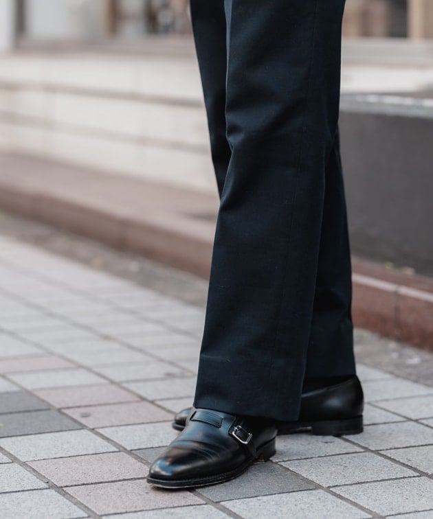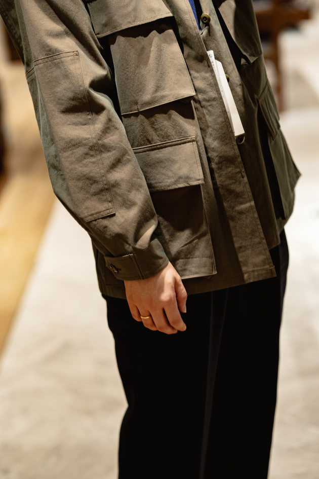 ややゆったりめのサイズ感、ウエスト周りの絞りも独特で、着用した時に正面からダーツなどの縫い線が見えないように施されているのが大きな特徴です。