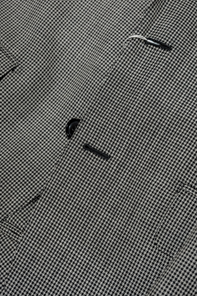 遠目からみるとグレー無地に見えるぐらいの、スーツに適した細かなハウンドトゥース。個人的には明るいグレー無地よりもこういうハウンドトゥースの方が、グレーのパキッとした明るさを軽減してくれている気がして、気恥ずかしくなくきやすいと思っています。