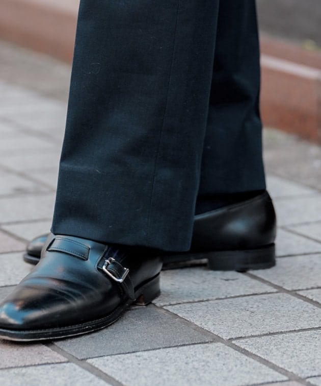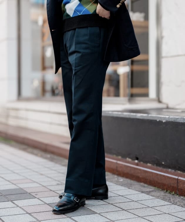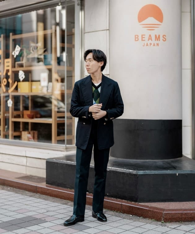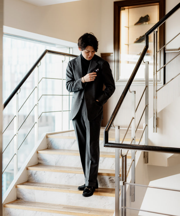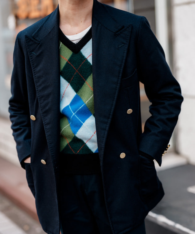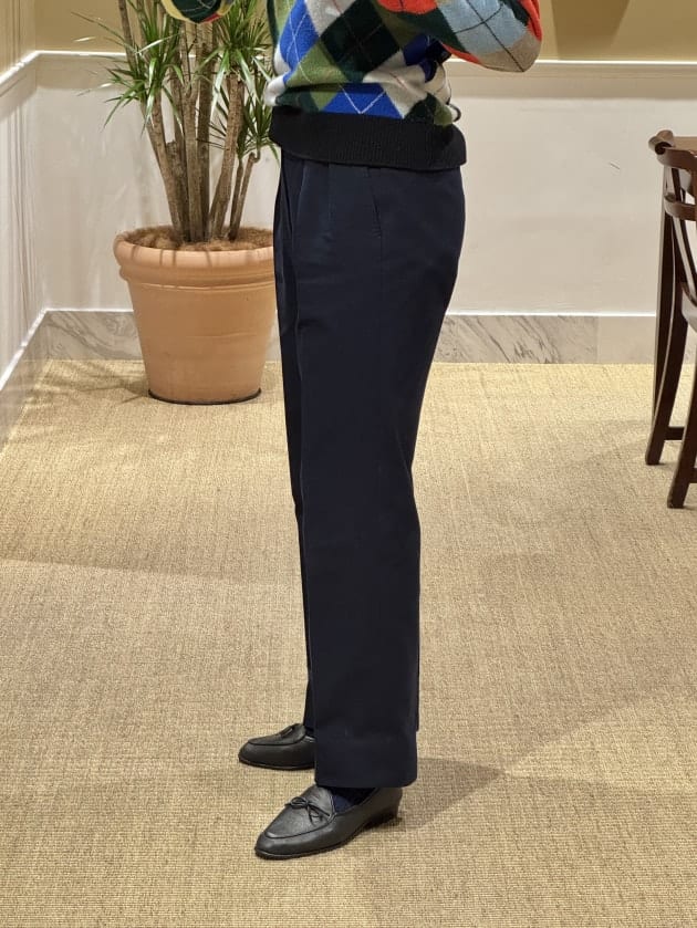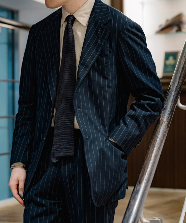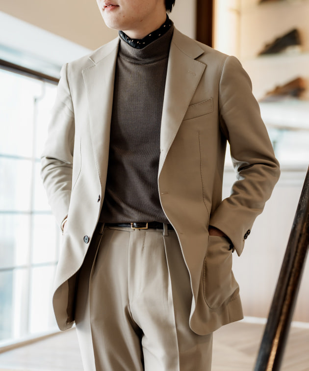 同様の直しをこのスーツでも施してますので、バランスはこちらのスタイリングを参考にしてみてください。