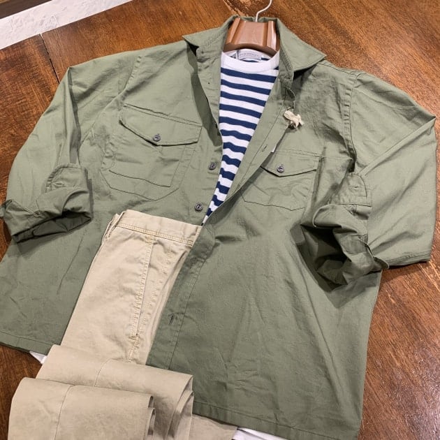 ミリタリーシャツをジャケット代わりに、インナーに合わせたカラーはWHITE×INDIGOです。至って普通のカジュアルコーディネートですが、このようにシンプルなコーディネートもおすすめです。ご参考まで。
