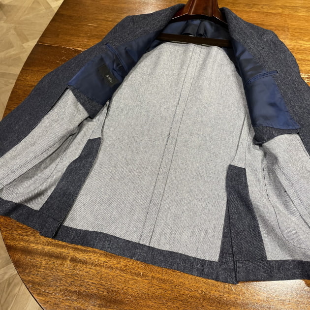 22秋冬シーズンが始動して、意外と(?)ご好評頂いているのがデニムスーツ、デニムジャケット。<Custom Tailor BEAMS>の生地でもお問い合わせが多いように感じています。既製品での展開はそれほど多くないのですが、<Brilla per il gusto>レーベルのこちらはかなり良いと思います。ウールデニム生地のシングルジャケットです。