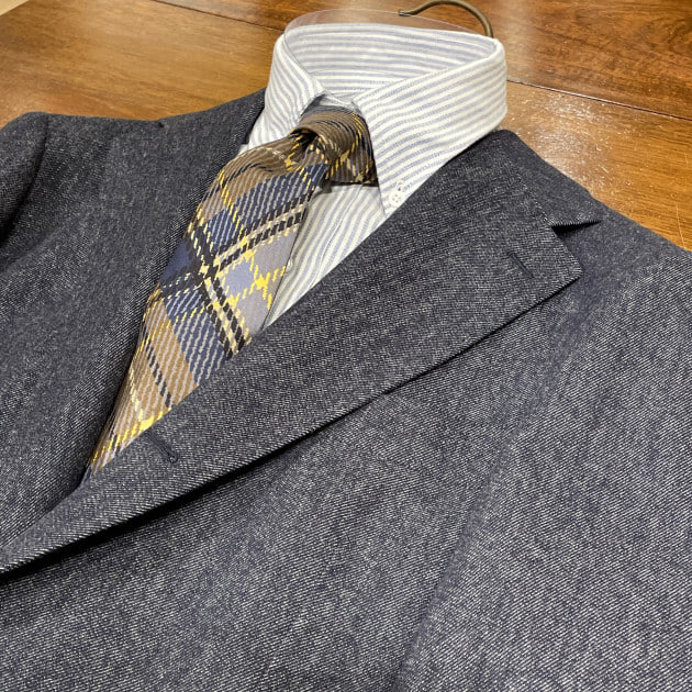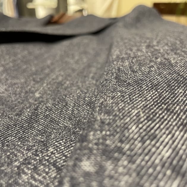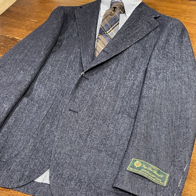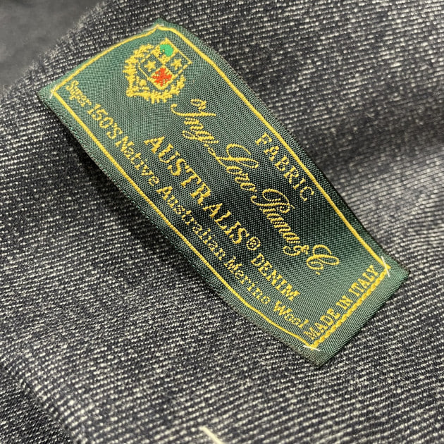 生地はLORO PIANA社のウール100%。スーパー150'sのオーストラリアメリノウール。非常に上質な素材感の生地で、見た目の感じはまさしくデニム。