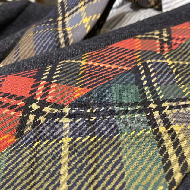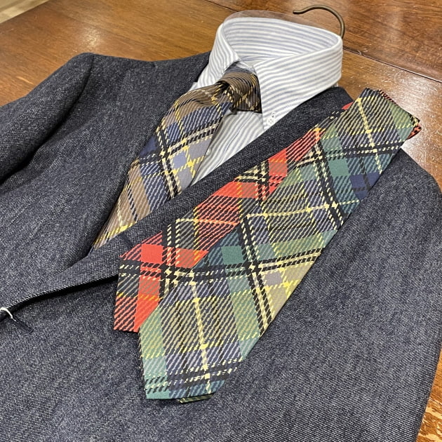 70年代の<FRANCO BASSI>タータンチェックタイを別注として復刻させたコチラ。プリントタイです。プリントタータンでこの柄、この配色。他のブランドではなかなか見ない感じですよね。独特の雰囲気があります。