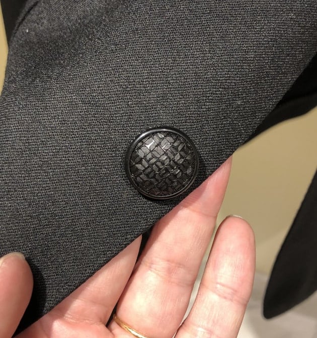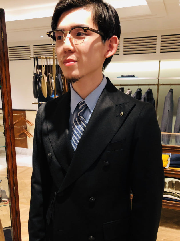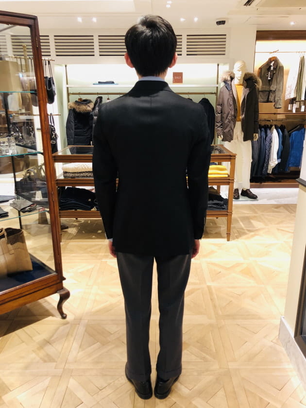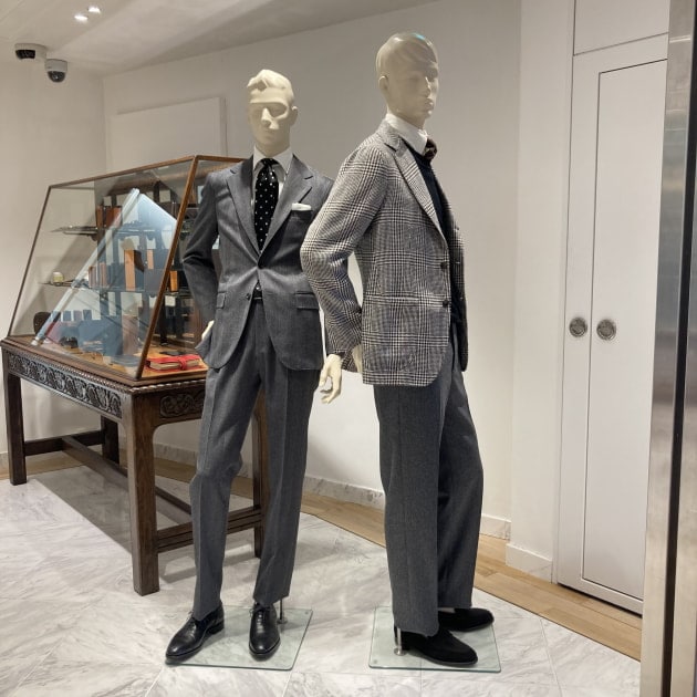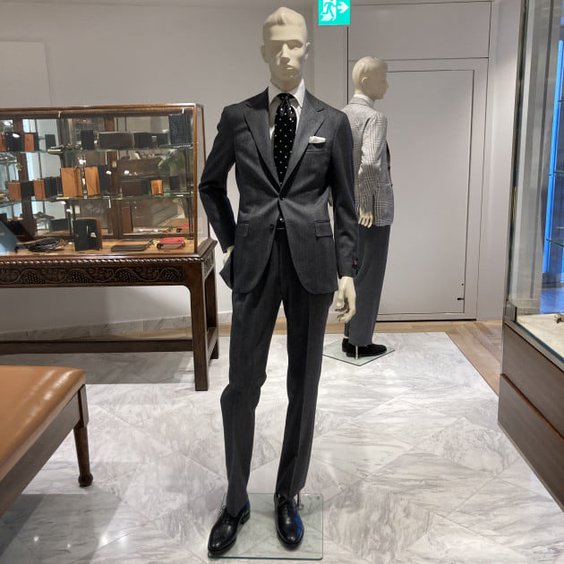 シャツは細い幅のストライプでクレリックカラー。ホワイト無地のシャツでもいいんですがマネキンにしてはシンプル過ぎるのでこちらにしました。