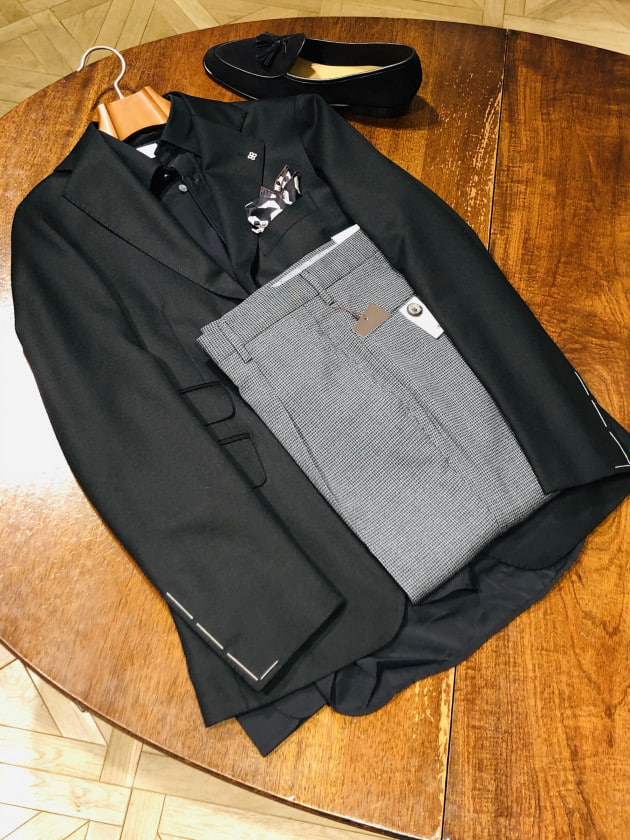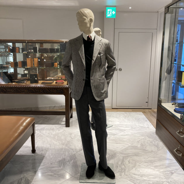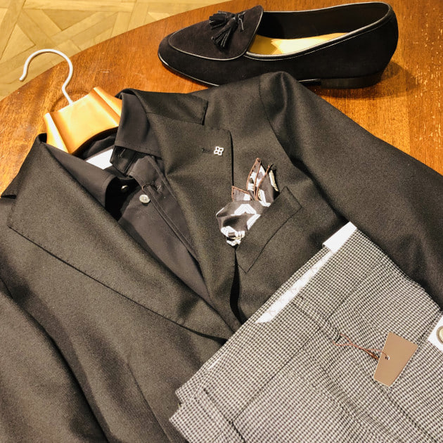 ジャケットは<ALFONSO SIRICA>のもの。グレンチェック柄ですがよーく見てみるとブラウンのペーンが入っていますね。このブラウンをどこかのアイテムで拾いたかったのでネクタイをブラウン系にしました。これを拾わずにモノトーンのアイテムだけで構成するとチグハグになります。