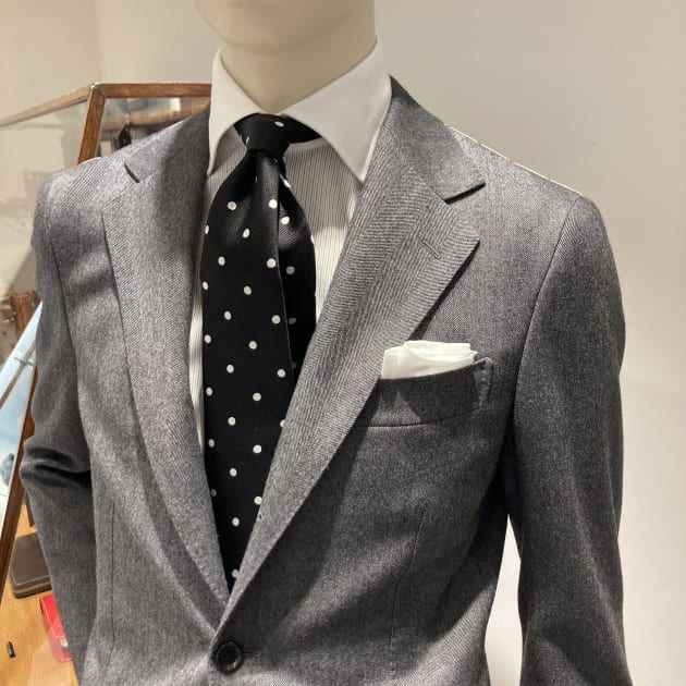 ネクタイはドットでよりクラシックなテイストに。チーフはお決まりの白。