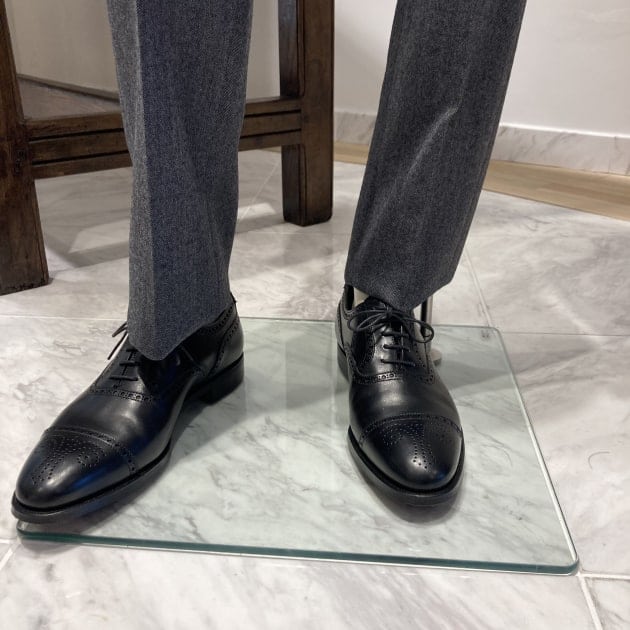シューズは内羽根が間違いないですね。セミブローグくらいがこのスタイルに合います。