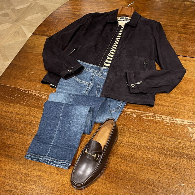 インナーにボーダーT、デニムパンツを合わせたオーソドックスなカジュアルスタイル。クセのないシンプルなデザインのレザージャケットなので、あまりトレンドに関係なくコーディネートできるアイテムだと思います。すぐには着ないと思いますが、秋は必ずやってきますからね笑
