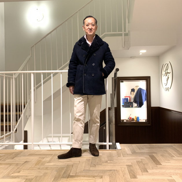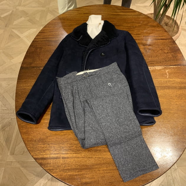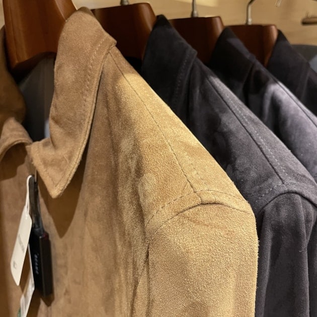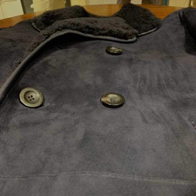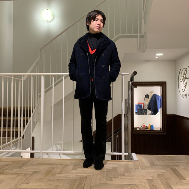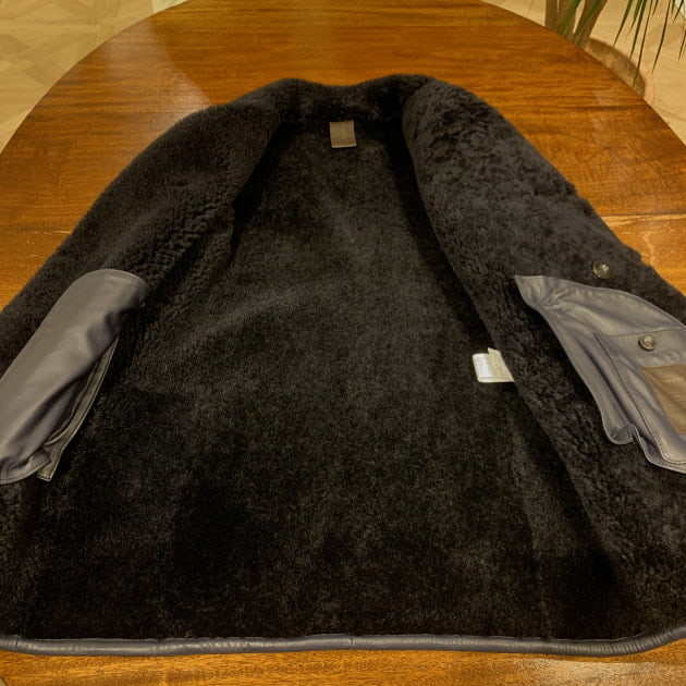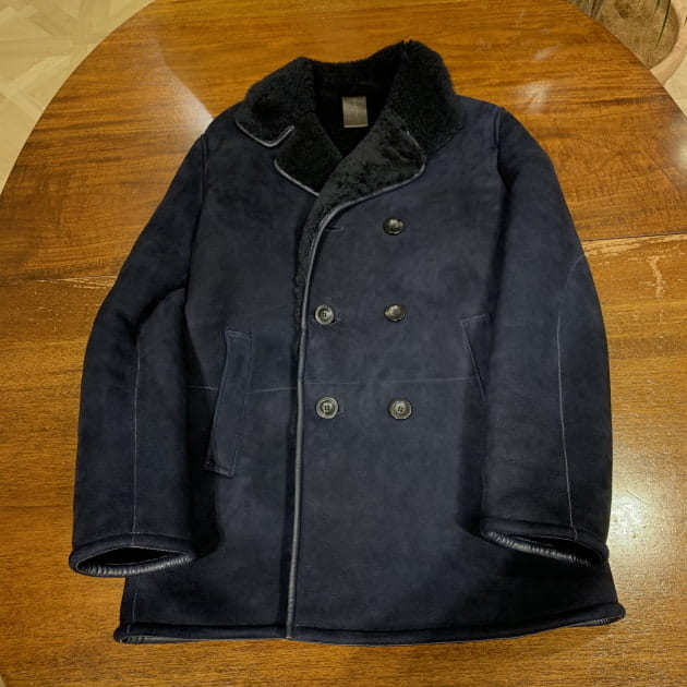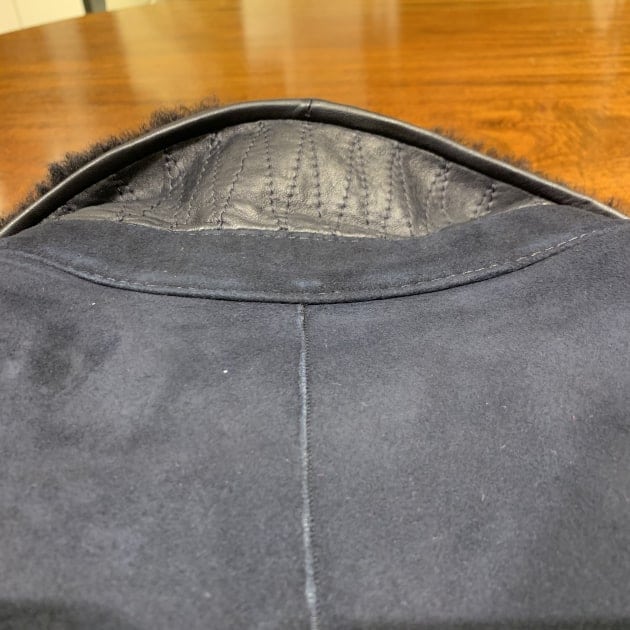 毛足が短く、柔らかいタッチの山羊革スエード。ネイビーカラーです。襟付きというのもポイントですね。スタンドカラータイプと比べると、グッと大人っぽい印象になります。