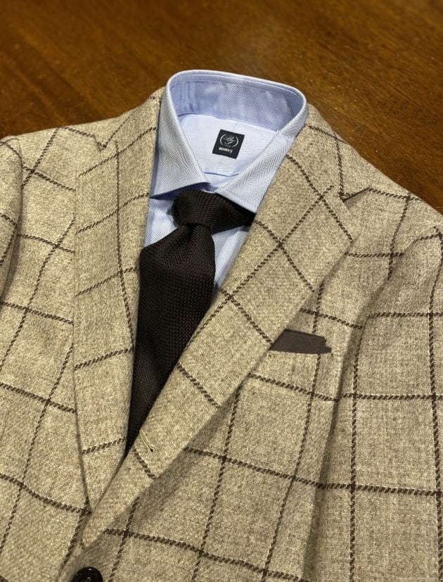 ブラウン×ブラックのネクタイを合わせ、