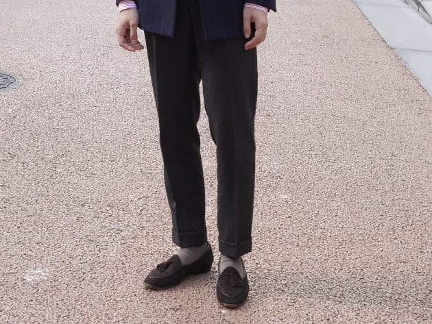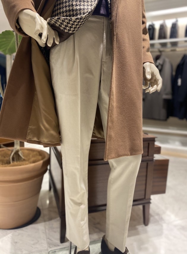 絶妙なベージュカラーのスラックスが
