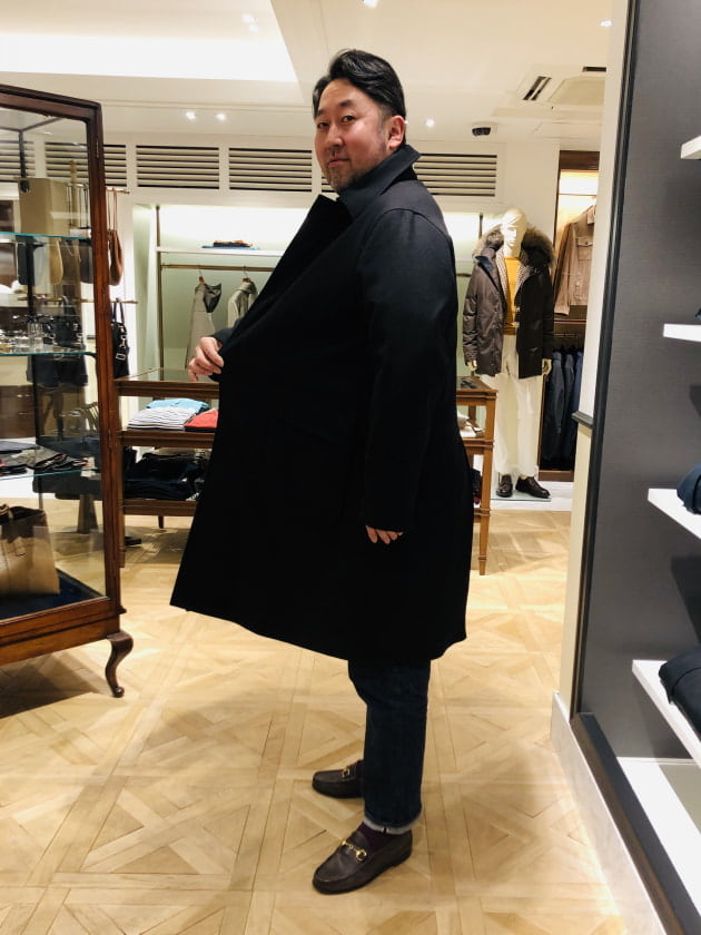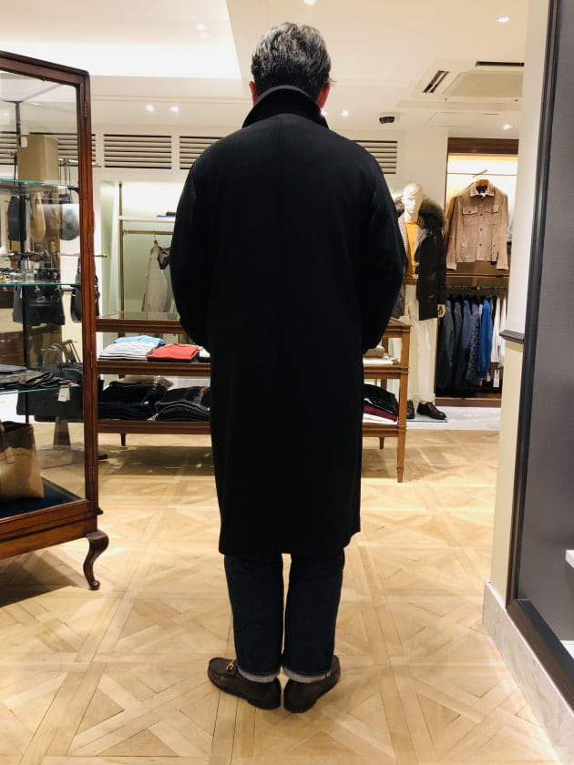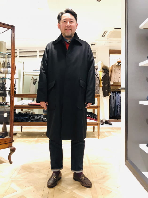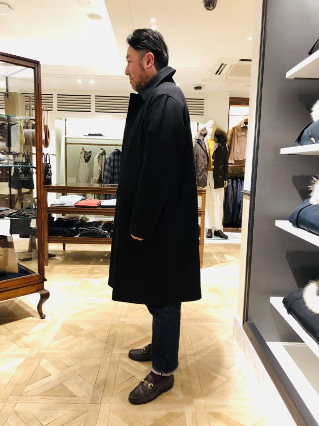 DUNKELD SHORTの名の通り、若干ショート丈のバランスもポイントです。「このコート欲しいです!」と言っているスタッフ伊藤に羽織ってもらいました。