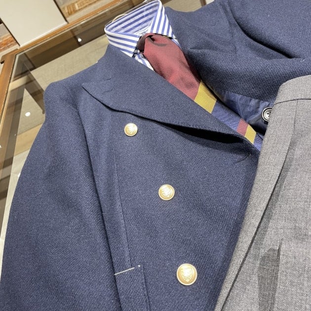 4つボタンダブルブレストで、パッチポケット仕様。数年前は金ボタンブレザーというとフラップポケット、なんならチェンジポケットまで付いているディティールのものが多かったのですが。最近はパッチポケットブレザーも多くなりました。
