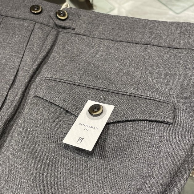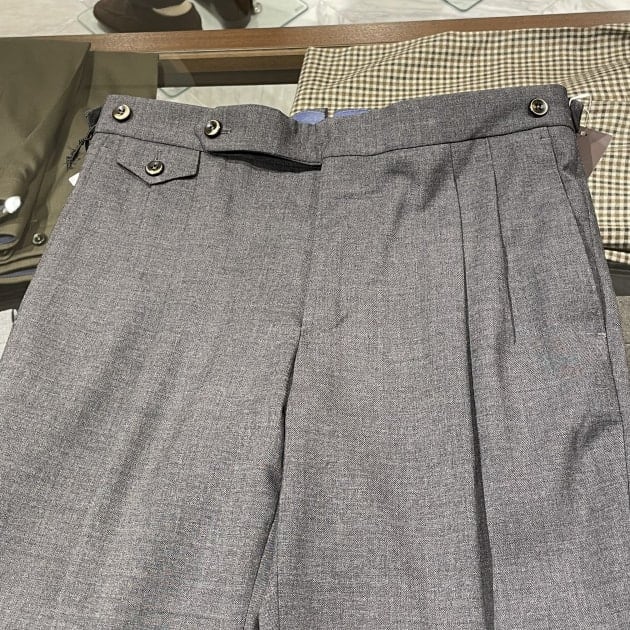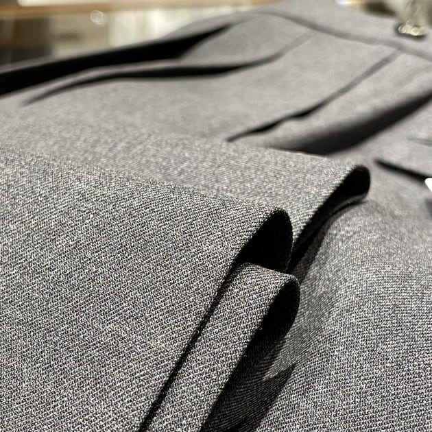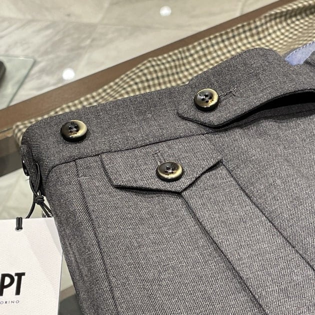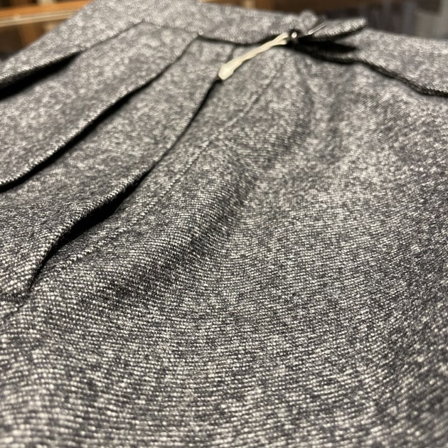 ウエストシェイプ位置が6ボタンダブルとほぼ変わりません。ボタンを留めると、しっかりシェイプの効いたモダンなシルエットに。この辺りのバランスも<De Petrillo>らしさを感じます。