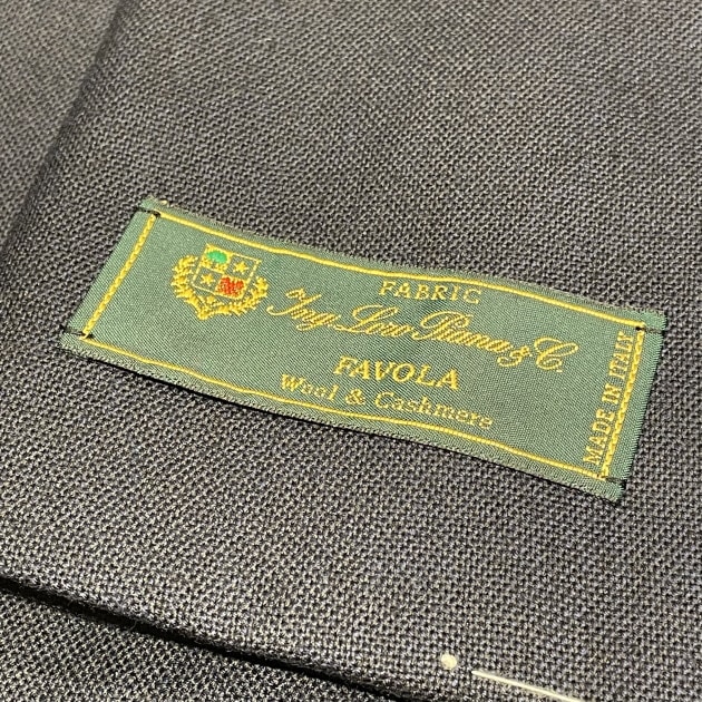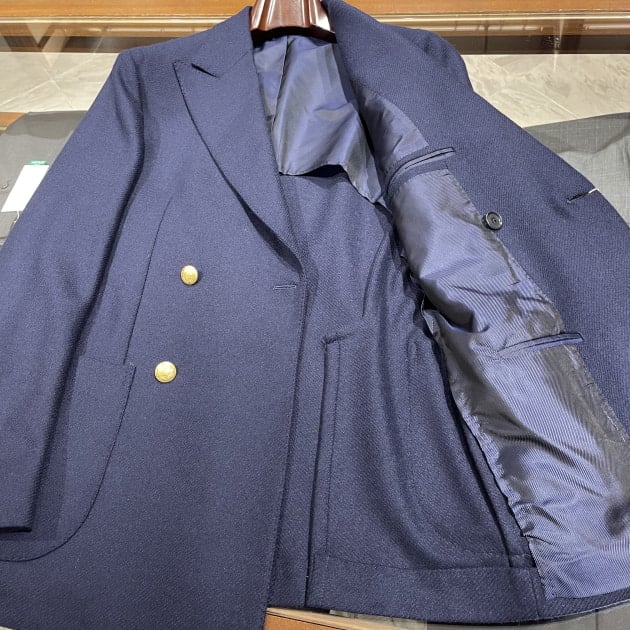 綾織のウール100%ファブリック。こちらもネイビーの発色はやや明るめのトーンですね。ゴールドメタルボタンとのコントラストも綺麗です。発色が良いです。