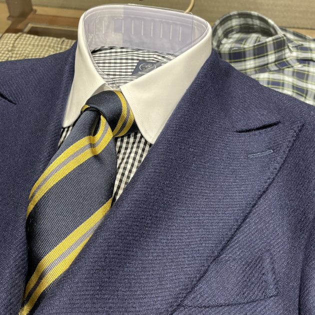 シャツタイで真面目に合わせるならこんな感じでしょうか。ご参考まで。