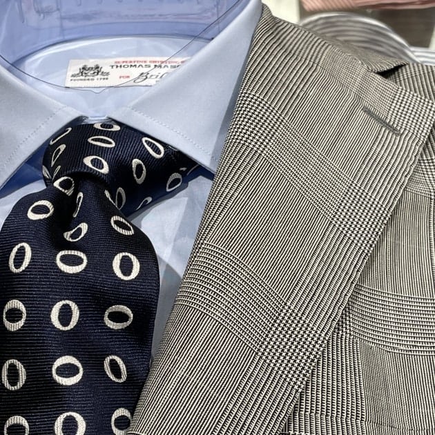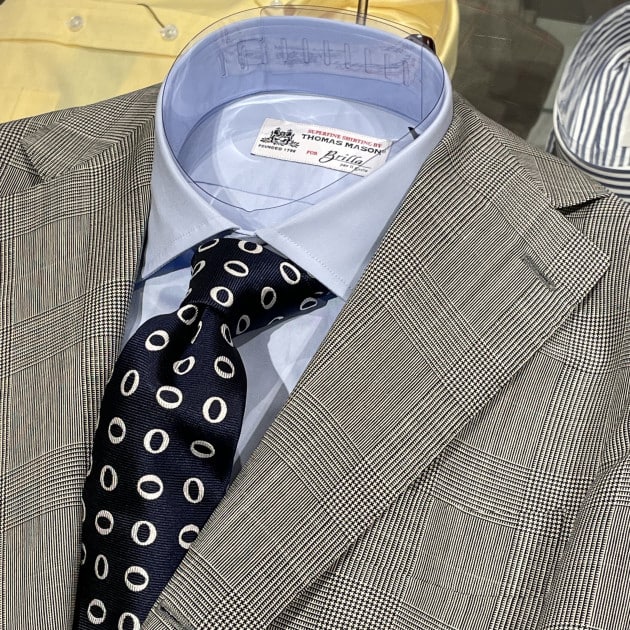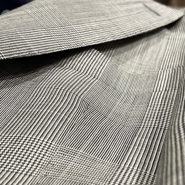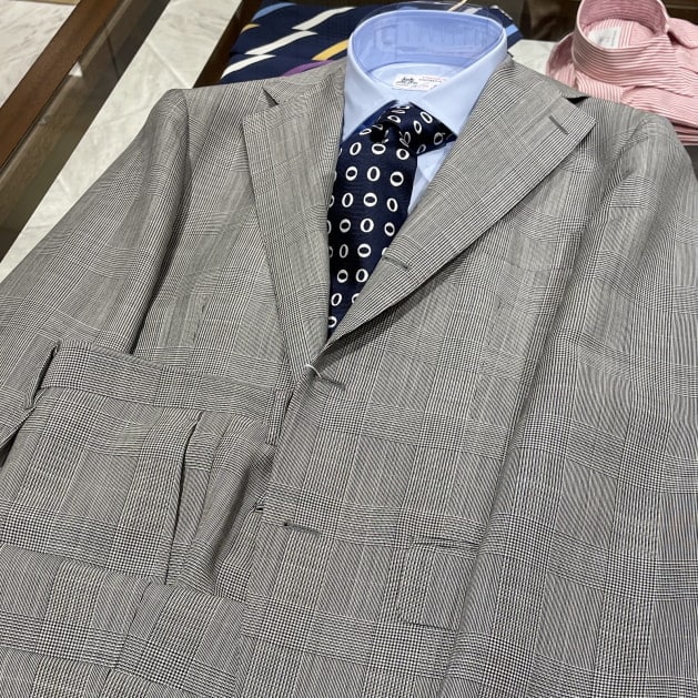 シャリ感のある春夏のDORMEUILグレンプレイド。機能性も備えたファブリックで、洒落た雰囲気のスーツです。グレー系のイメージでスーツの新調をお考えの方には、是非おすすめしたいモデルです。