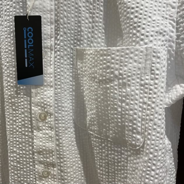 こちらはコットン77%ポリエステル22%。COOLMAX(R)素材です。比較的凹凸感の強いシアサッカー。ハリ感が強く、パリっとしたタッチです。