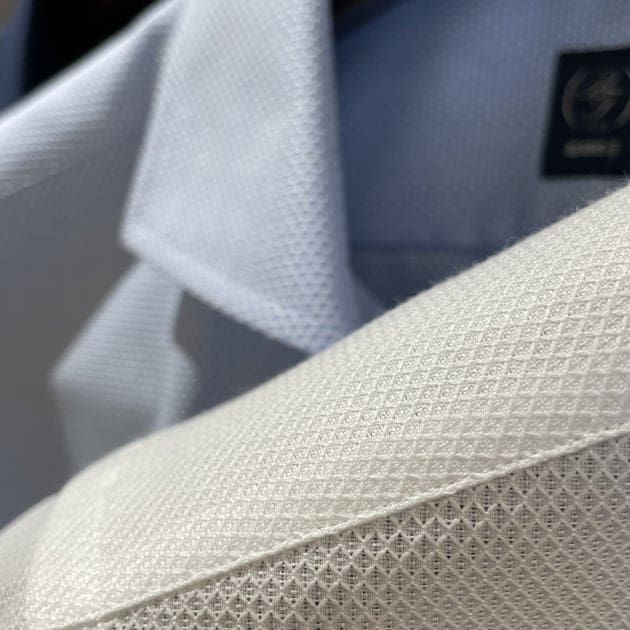 まずはこちら。夏の定番カラミ織りのCOOLMAX(R)生地。カッタウェーカラーです。