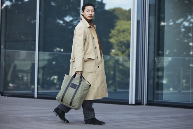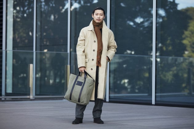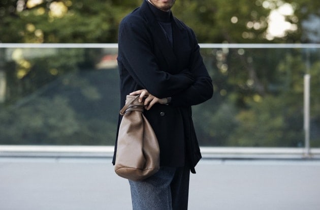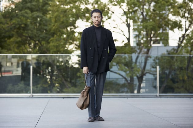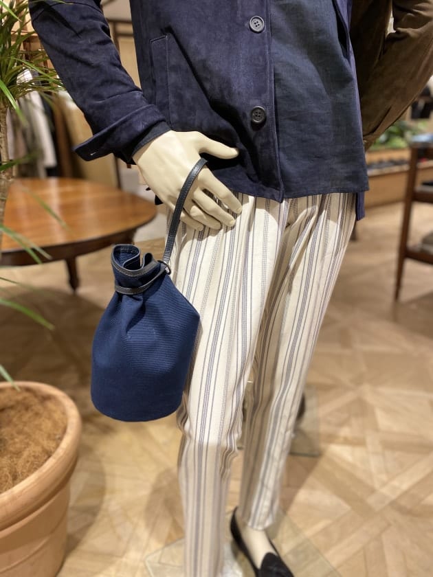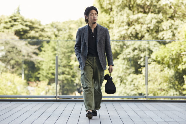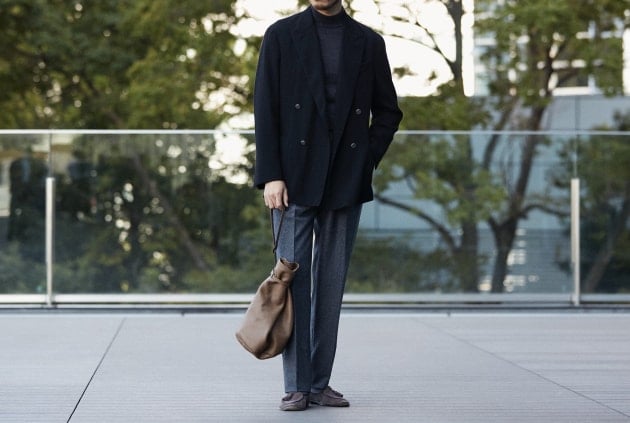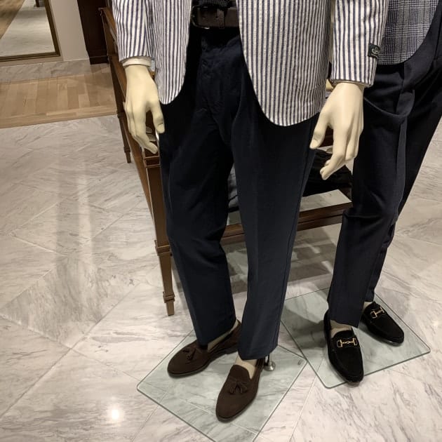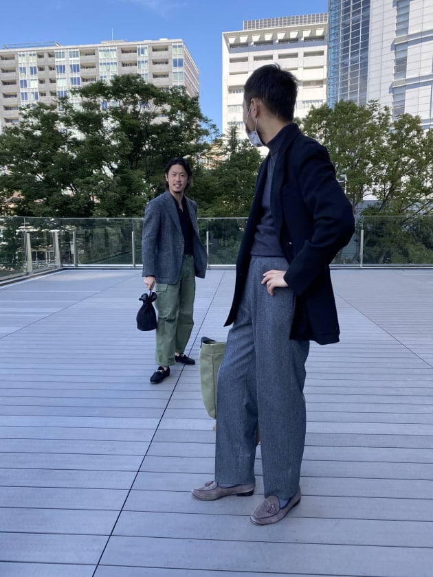 こちらはコットン系のスラックスの方が相性が良い印象。お仕事でビジネスカジュアル的な装いがOKという方なら、こんな感じも良い雰囲気ではないでしょうか。