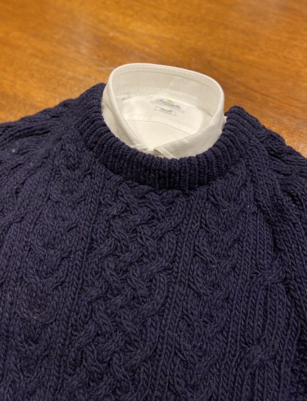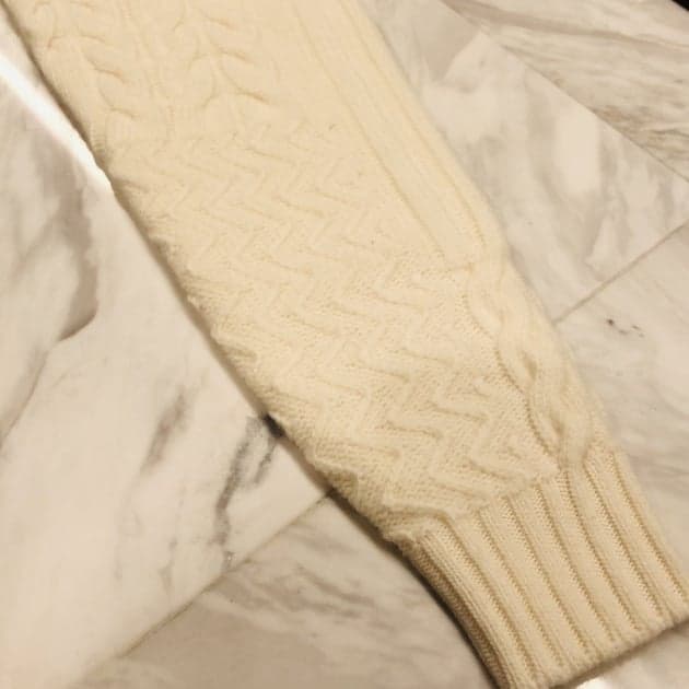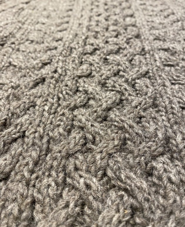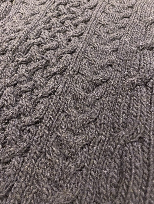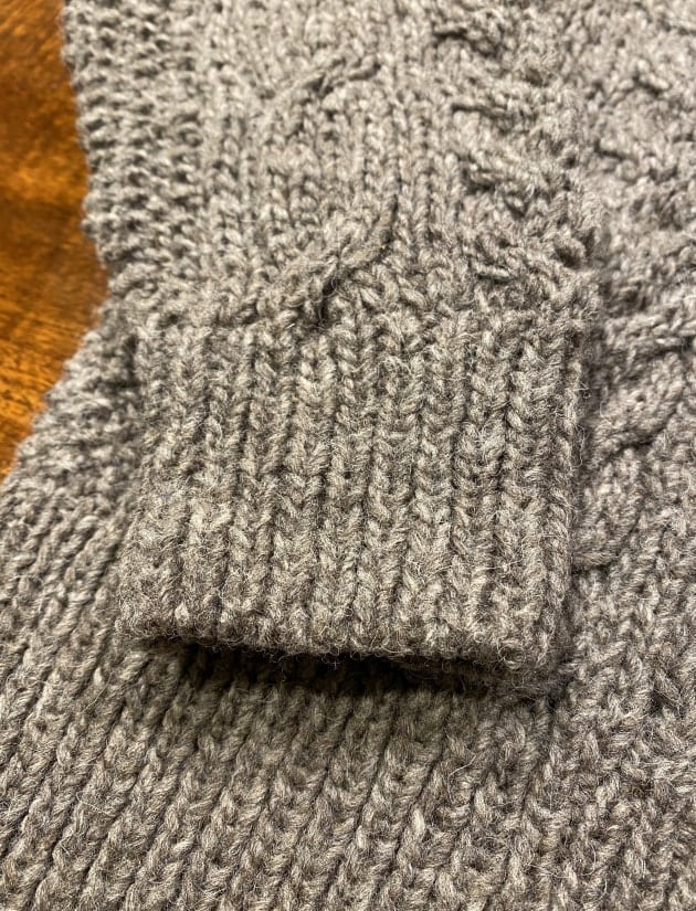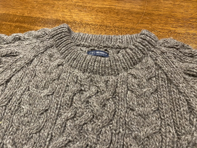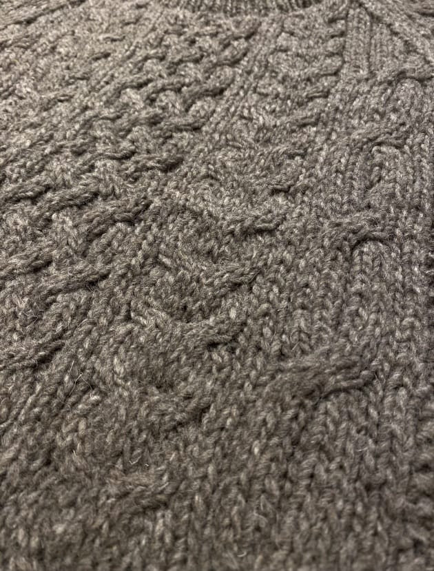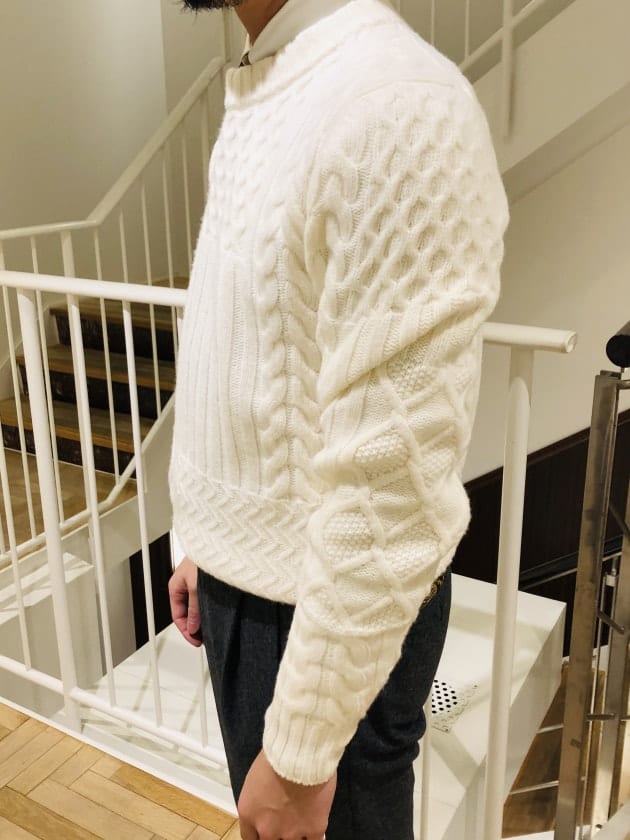ミドルゲージ程度の素材感です。そこまで肉厚なケーブル編みではないので、ジャケットのインナーにも自然にレイヤード出来そうな感じですね。