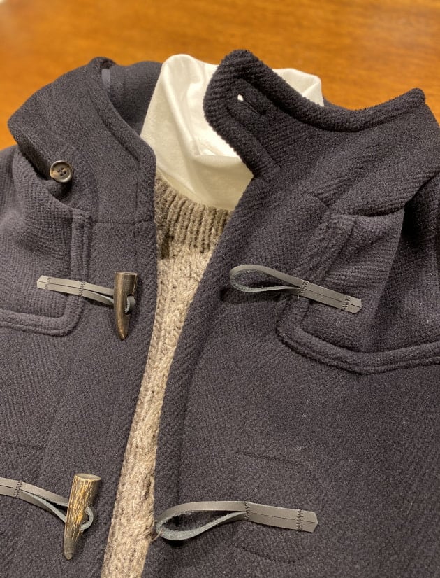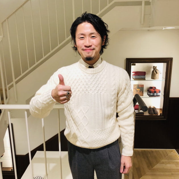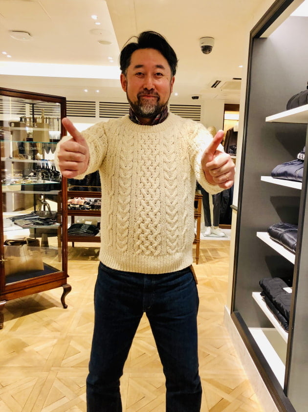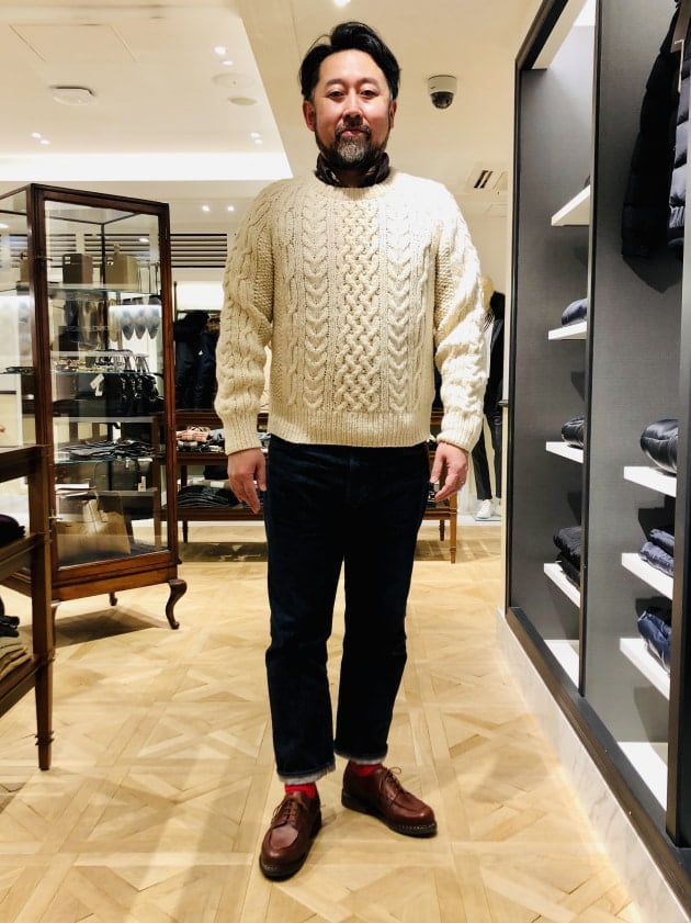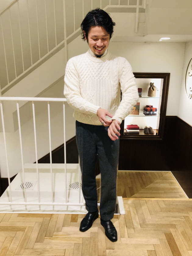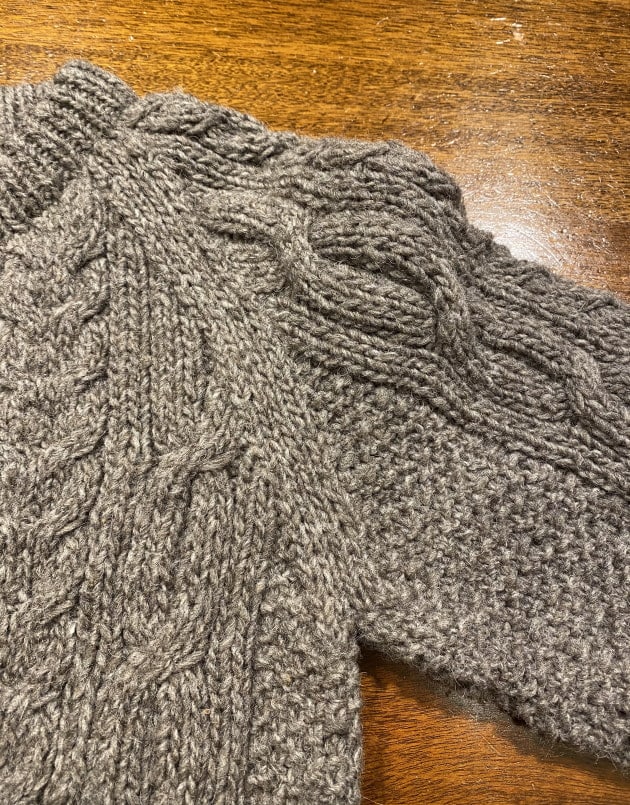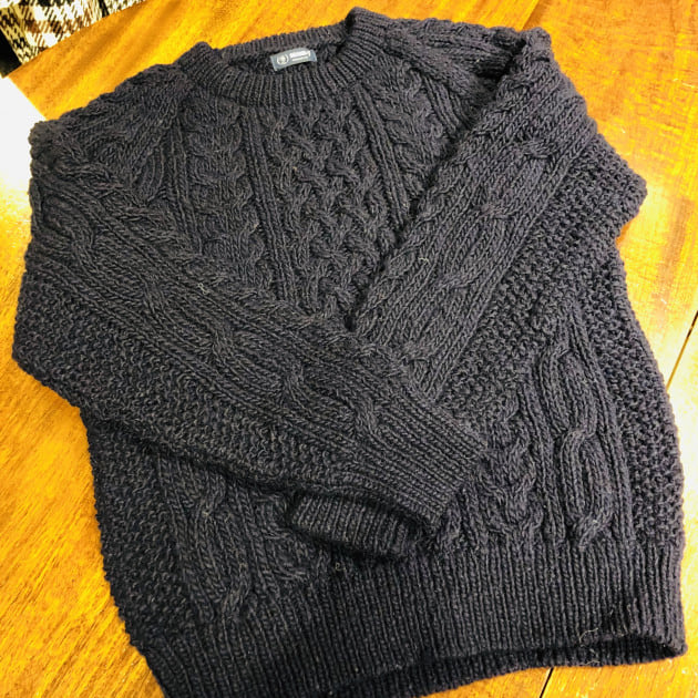 ミドルゲージ程度の素材感です。そこまで肉厚なケーブル編みではないので、ジャケットのインナーにも自然にレイヤード出来そうな感じですね。