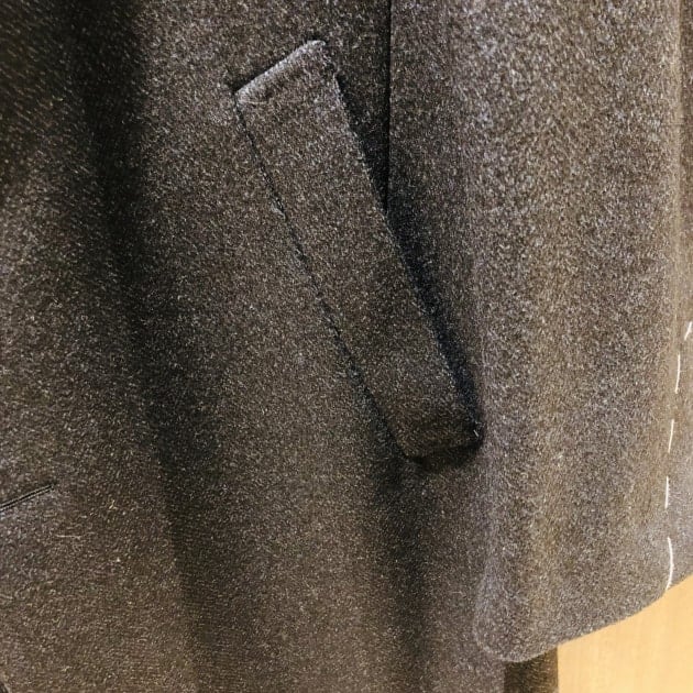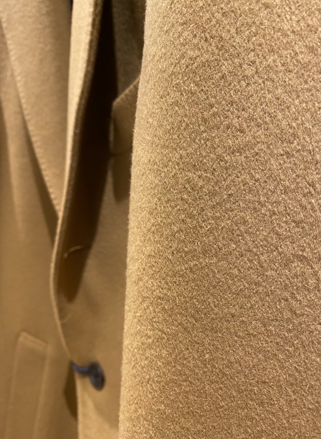 表面はダイアゴナルの織り柄。ふっくらとした、適度に厚みのある生地です。コートですからね、このくらいの素材感が丁度良いと思います。