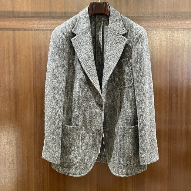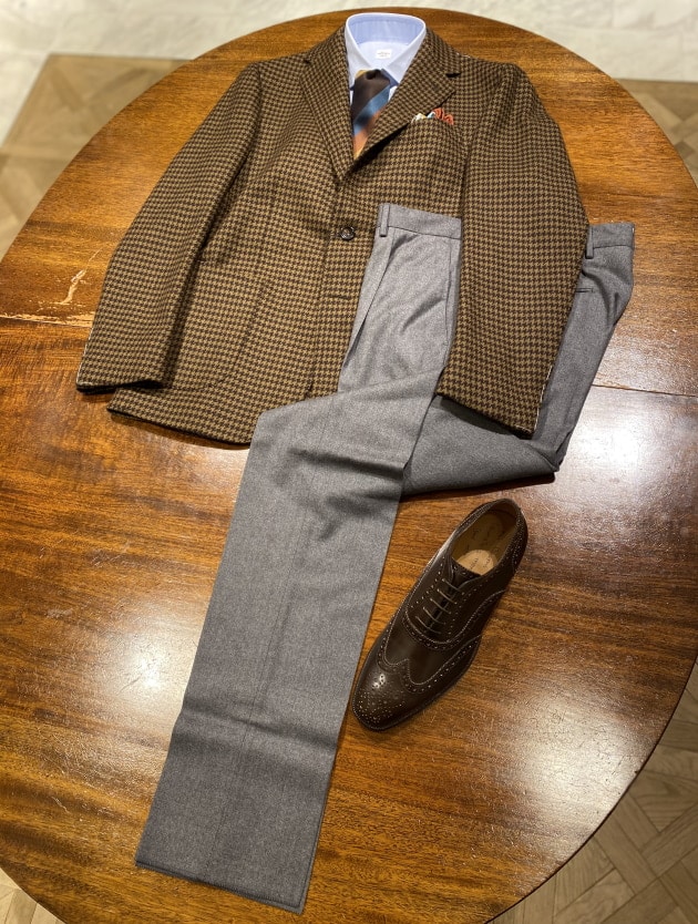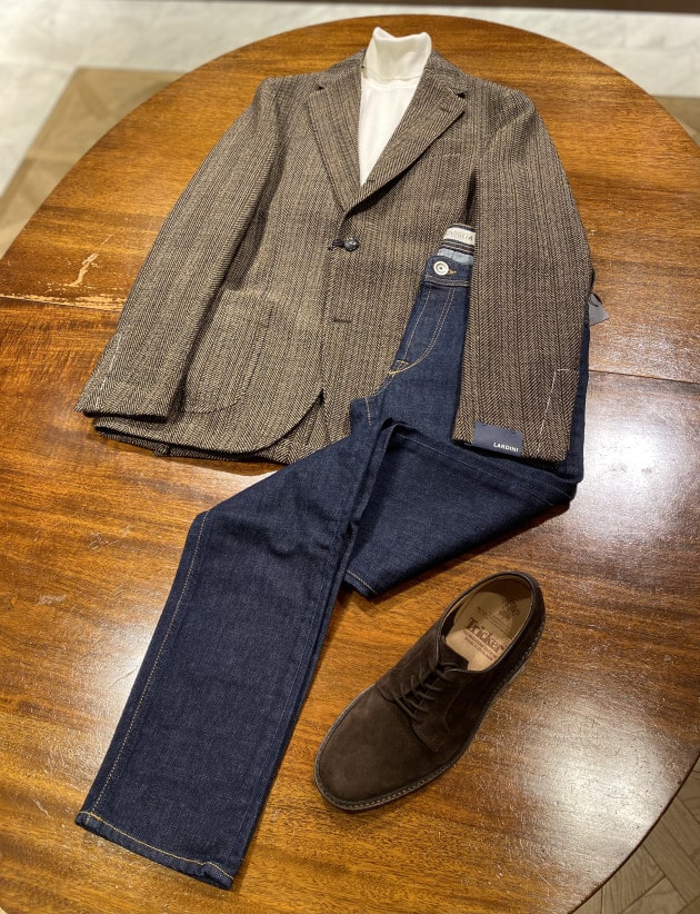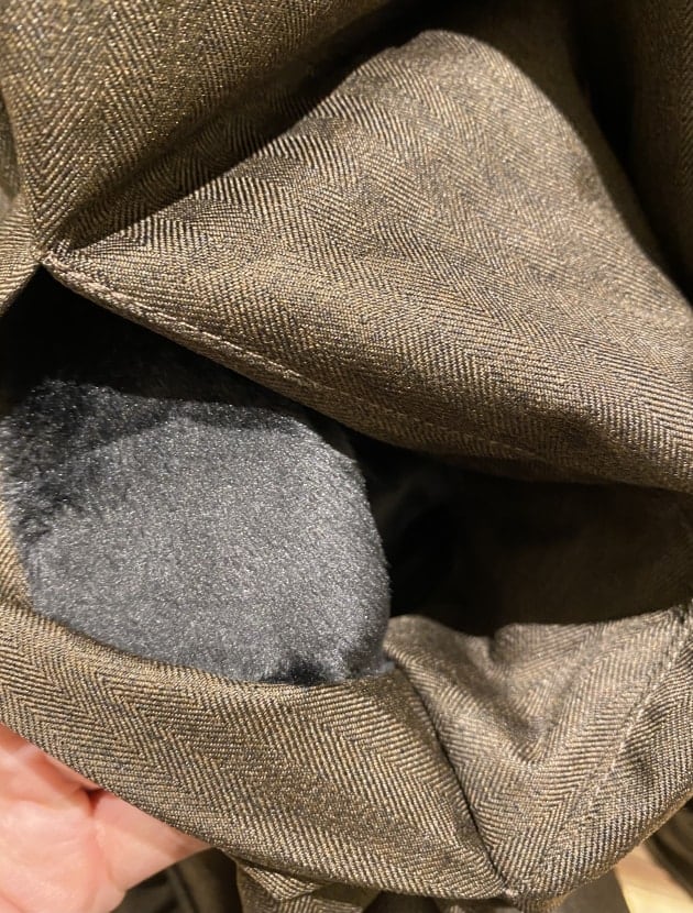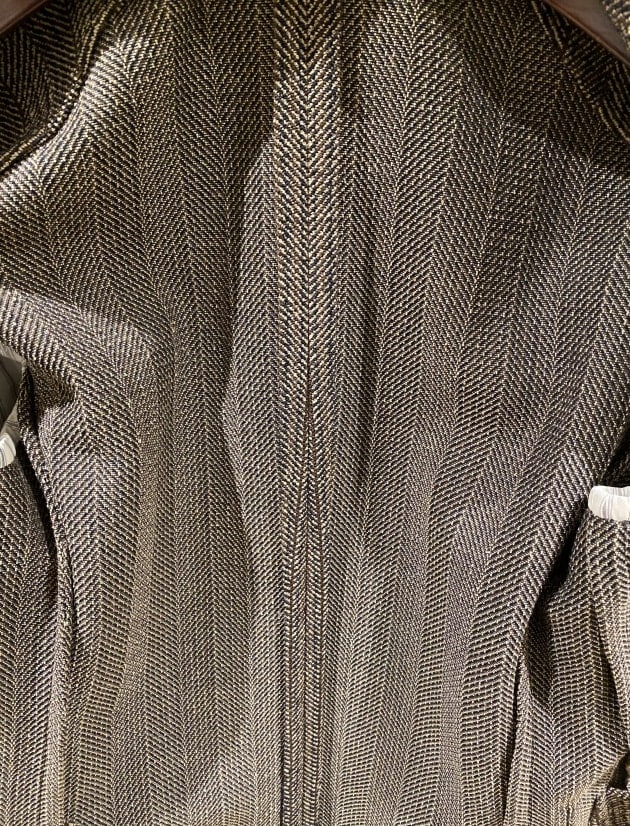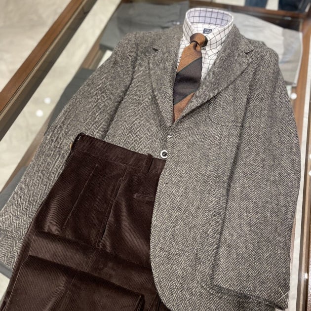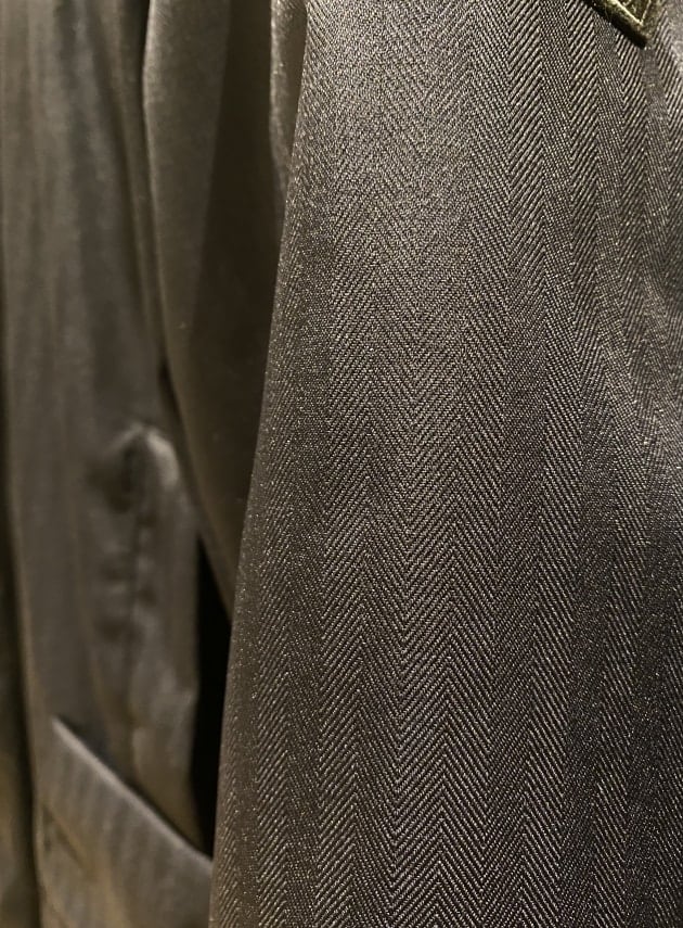 生地はLT.BROWNのヘリンボーン。ソフトツイードですね。見た目に反してソフトなタッチ。軽さも感じられます。色の見え方はかなりグレイッシュでほんのりブラウンという感じでしょうか。なかなか雰囲気ありますよ。