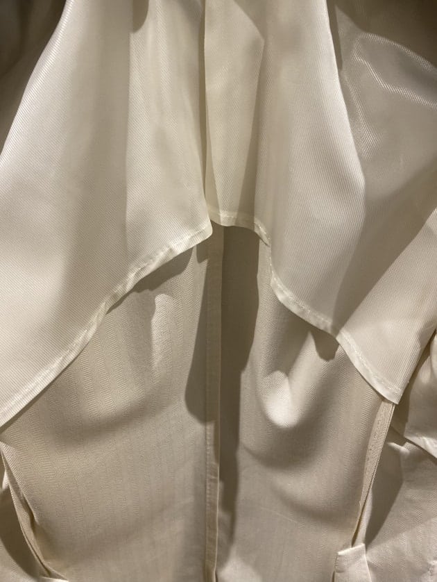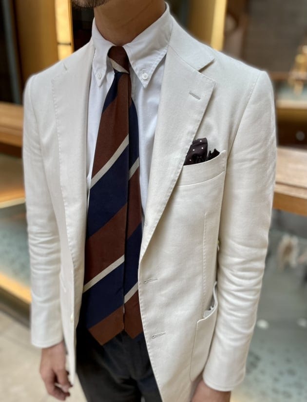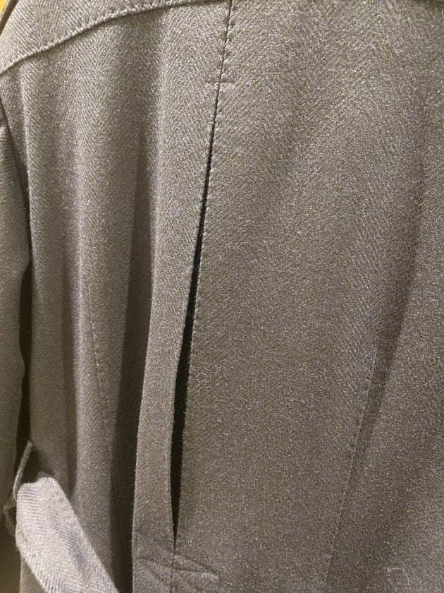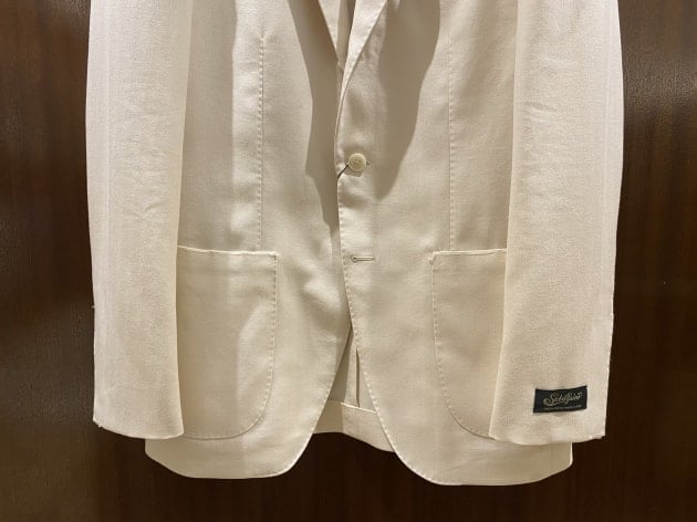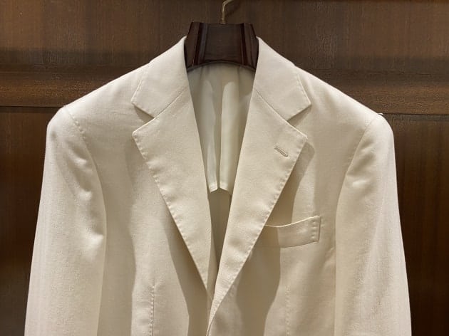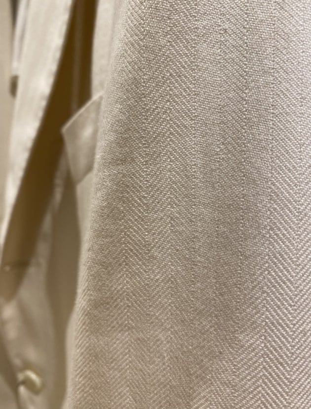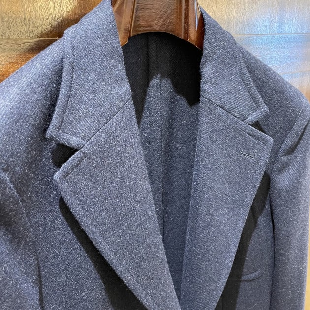 直線的なマシンステッチの表情もこのモデルの特徴的なディティール。カルゼー生地だとこの見え方が顕著ですね。ナポリサルト系とは一味違う表情。ディレクター曰く、アメリカンデザイナーズ的な雰囲気のジャケット。