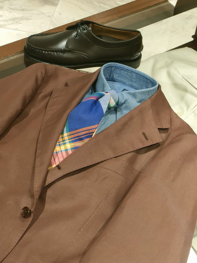 グレンプレイドのスーツと見せかけて実はシアサッカー、というのもツイストが効いていて良いですね。