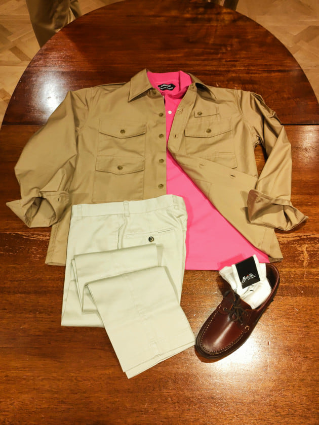 ジャケットは〈AUBERGE〉のシャツライクなチャイナジャケット。有名芸術家が愛用していたジャケットをモチーフに制作した1着で、洒落たデザインにコテコテ過ぎない品の良さを併せ持つ秀逸なバランスが魅力です。