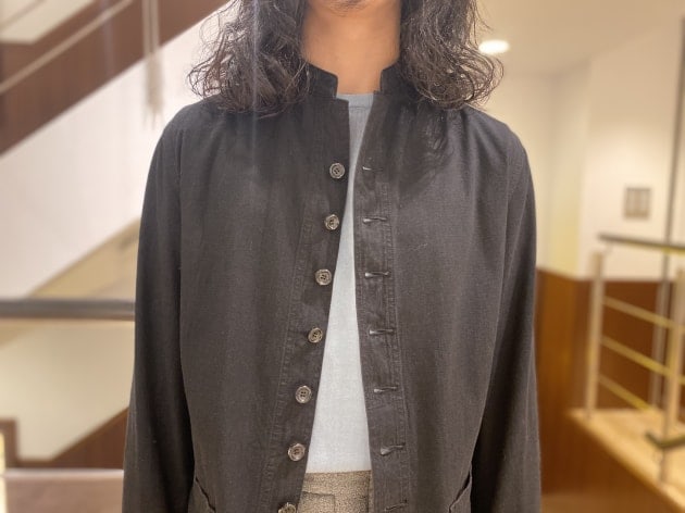 トレンチコートを思わせる大きめの襟や