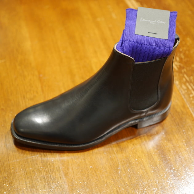 カシミヤ特有の艶っぽさがあるので、足元はレザーシューズがオススメです。アンライニングの<Baudoin & Lange>でリラックスしつつも艶感は残しつつ。薄いブルーのソックスでホワイトよりも爽やかにしました。