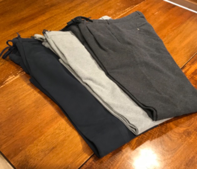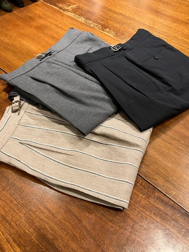 左からリネン、トロピカルウール、リネンコットンの素材を使用したパンツが並んでいます。