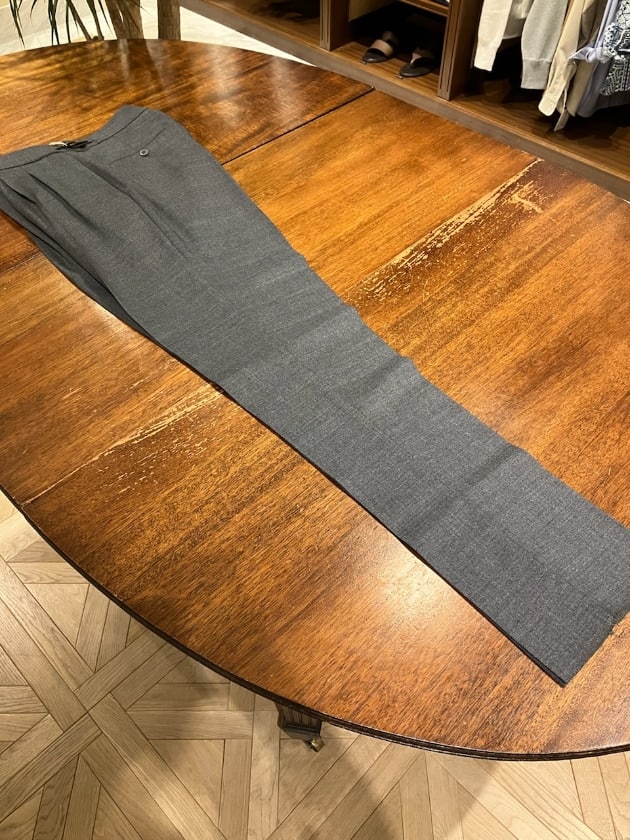 腰回りのディテールは、2インプリーツのサイドアジャスター。最近のパンツでは、定番の形ですね。