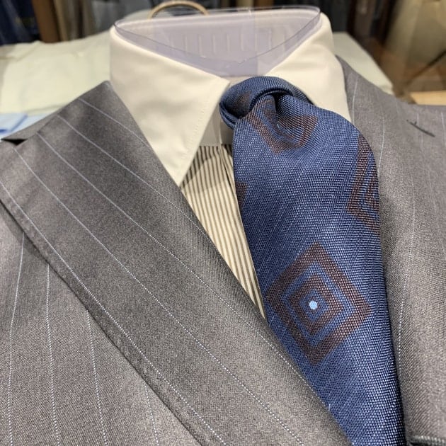 こちらは襟型がタブカラー。比較的オーソドックスなブルーストライプです。