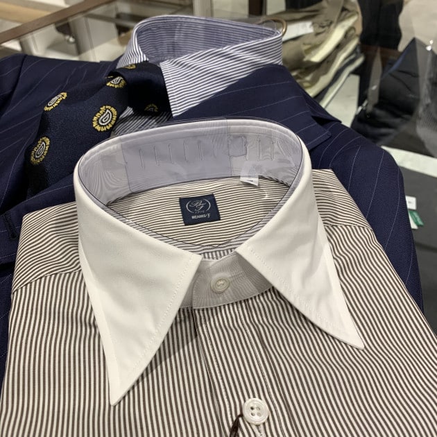 ブラウンのヘアラインストライプに、マスタードイエローのような発色の太ストライプ。襟型も含め個人的に好き感じはこちらですかね。