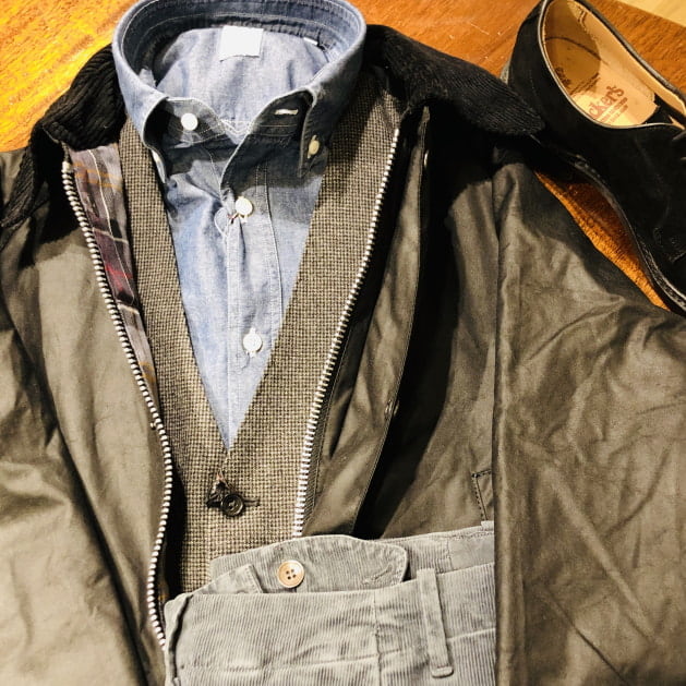 ラギッドな<Barbour>のオイルドジャケットに合わせています。モノトーンコーディネイトなのでどこかモダンな雰囲気。