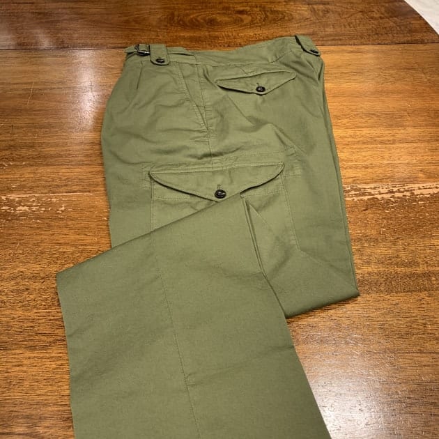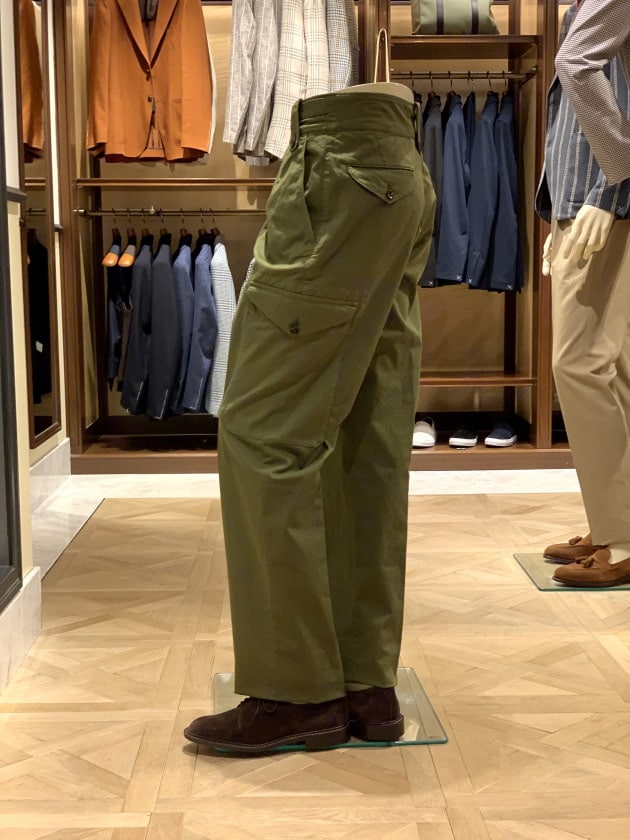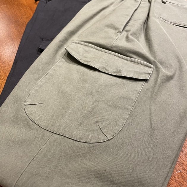 マチの無い控えめなカーゴポケットが両サイドに付きます。それ以外のディティールは基本的に通常のMASACCIOと同様です。コットン98%ポリウレタン2%生地。コテコテのミリタリーパンツはちょっと苦手。という方にも無理なくお召し頂けそうなカーゴパンツです。