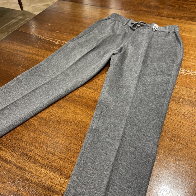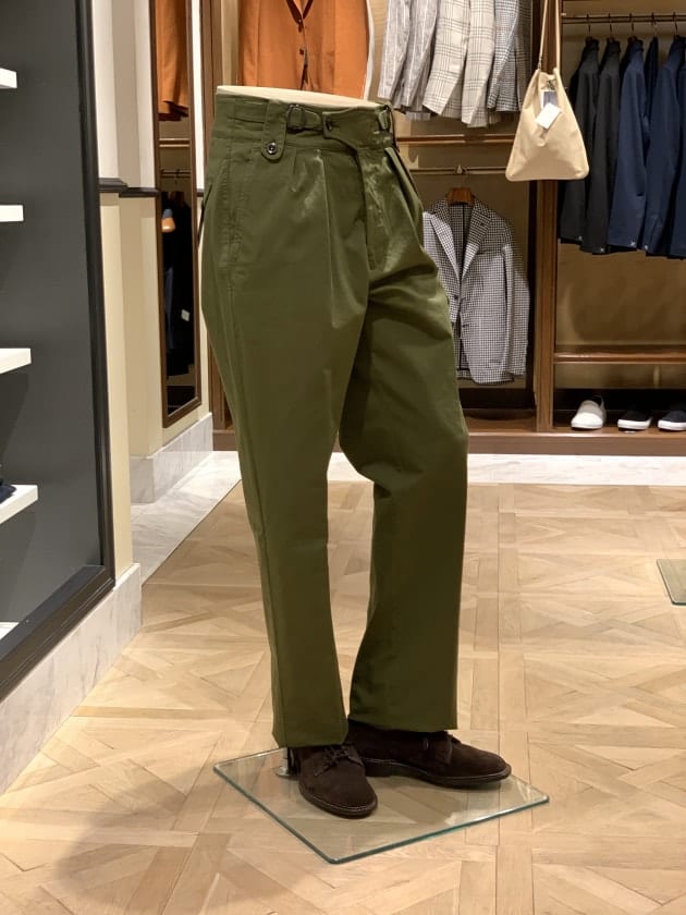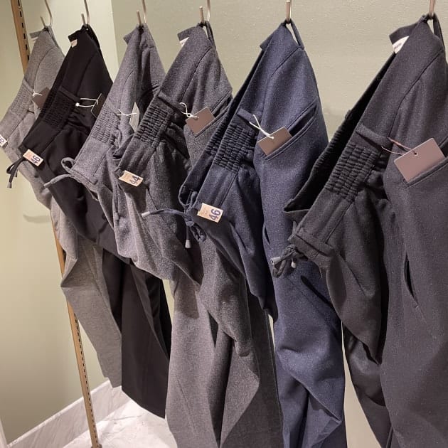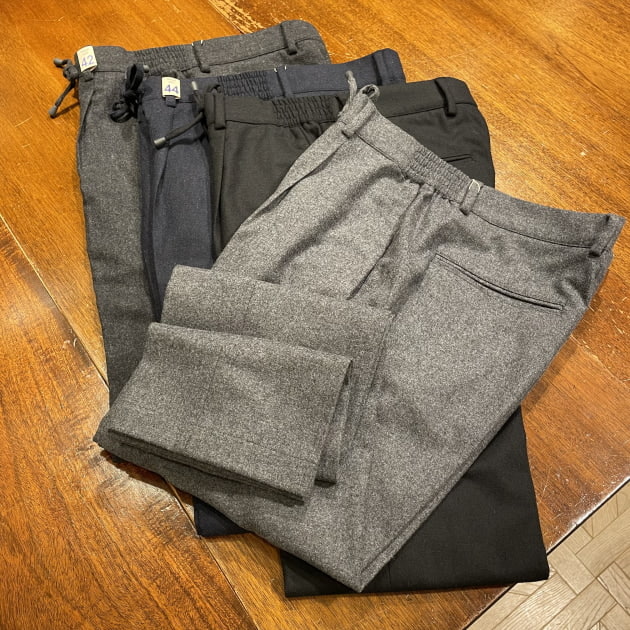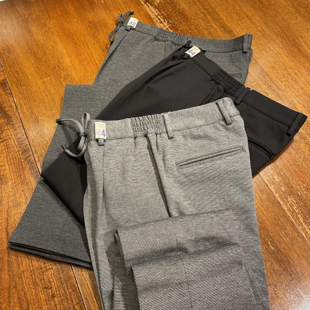もうお馴染みでしょうか。モデルはMASACCIOです。1プリーツドローコード付きのデーパードシルエットモデルです。イージーパンツ的なディティールを備えていながらも、スラックスのようなスリムシルエットが特徴です。
