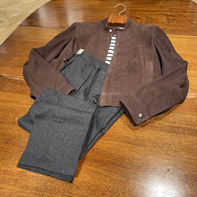 汎用性の高さも<giabsarchivio>の魅力です。あくまで一例としてレザーブルゾンと合わせましたが、様々なパターンのコーディネートで活用出来るパンツです。
