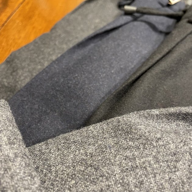 ウール68%ポリエステル30%ポリウレタン2%です。多少起毛感の感じられる素材感。これは秋冬用ですね。スラックス的な見え方のするパンツなので、ビジネスカジュアル的なイメージの使い方も良さそうです。
