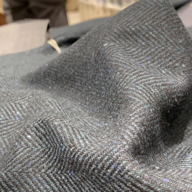 比較的毛足の短い、さらっとしたタッチのウールヘリンボーン。それほど畝も立っておらず、織り柄の主張は控えめです。扱いやすそうな、クセのない生地感が良いですね。良い意味で普通な感じが魅力的です。