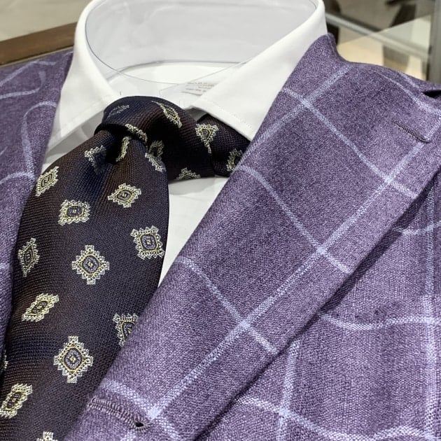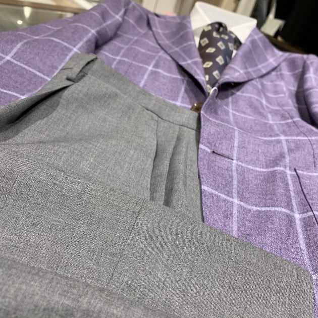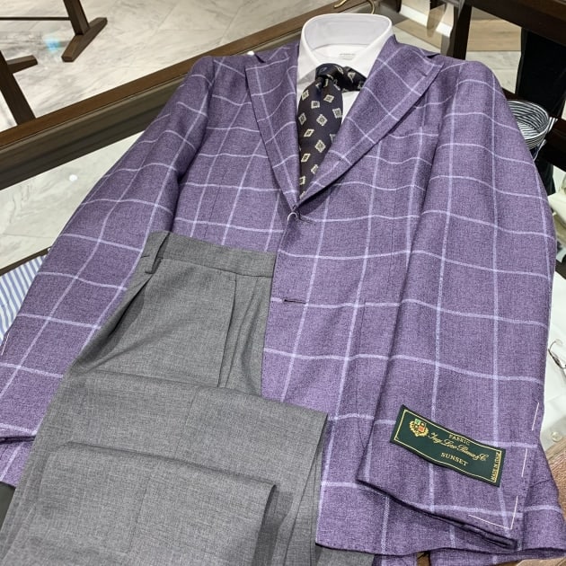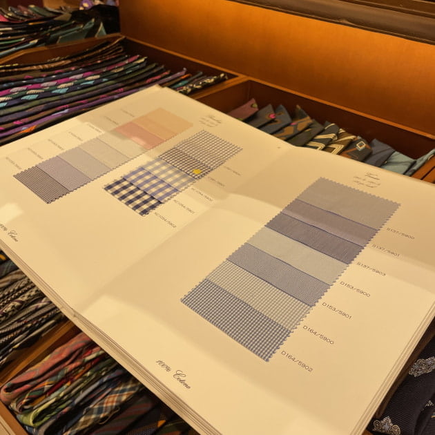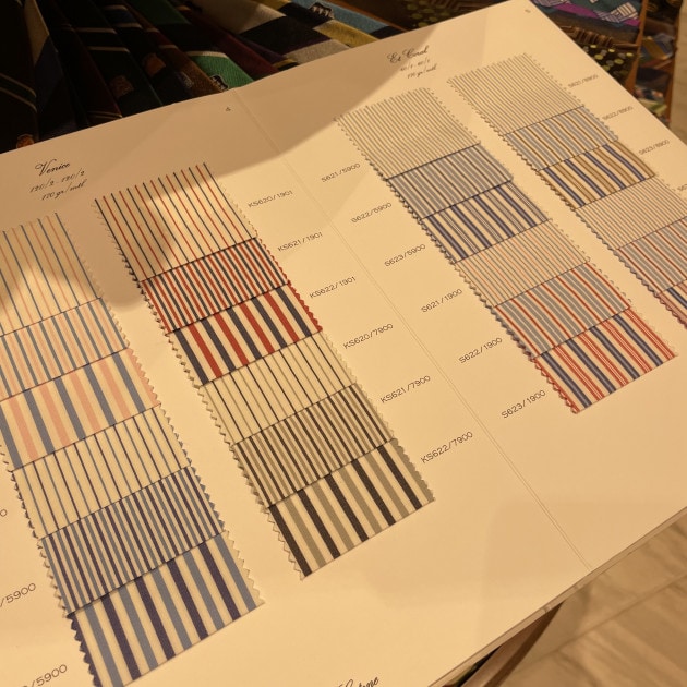 撮影してきたのは生地見本のごく一部です。ビジネスユースで使えるオーソドックスな色柄の生地、春夏シーズン用のリネンなどなど。イタリアブランドなので、生地コレクションは甘めの雰囲気の色柄が多かった印象です。ちなみに私は、